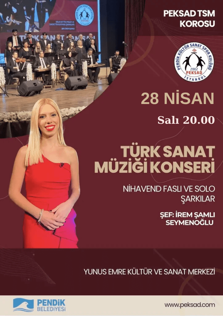 Pendik Kültür Sanat Spor Kulübü (PEKSAD) Türk Sanat Müziği Korosu, Türk müziğinin zarif ve köklü repertuvarından seçilen eserlerle sanatseverlerle buluşmaya hazırlanıyor. “Nihavend Faslı ve Solo Şarkılar” başlığıyla gerçekleştirilecek konserde, klasik Türk musikisinin seçkin eserleri dinleyicilere unutulmaz bir müzik akşamı yaşatacak.
